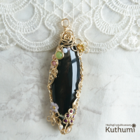 パステル画のような、淡い水彩画のような色合いのエデナイトカルサイトを、新しいstyleでドレスアップしたJewelry。表面はお花達で包み、裏面は渦巻きと曲線で自由に流しています🍀