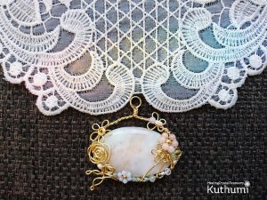 パステル画のような、淡い水彩画のような色合いのエデナイトカルサイトを、新しいstyleでドレスアップしたJewelry。表面はお花達で包み、裏面は渦巻きと曲線で自由に流しています🍀
