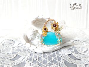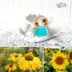 暑く輝く太陽を見上げるように咲くイエロージェイドのひまわりを、夏空色のペルー産のアマゾナイトバッグに飾る✨