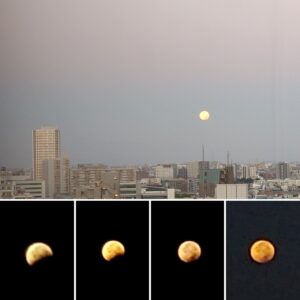 窓をから外を見てみたら、ギリ皆既月食後半が見えたので、4時半から満月に戻る5時過ぎまで月を追って撮ってみる事に✨