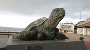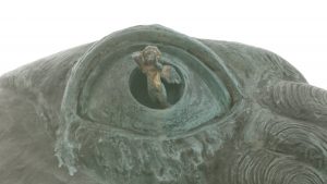 そう、それとビックリしたのは、ここに粟津潔さんが制作した亀のオブジェがあるのですが、よ~くみると大亀の右目の中に鳥が、左目に天使がいるの💫