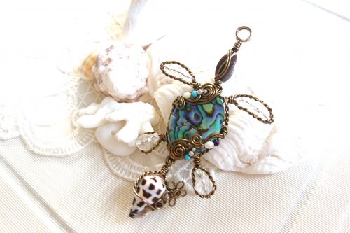 クリスタルビーズとワイヤーで作った天使とクリスマスツリー。月と天使のチャームを下げて、下にはクリスマスプレゼント3つ✨
